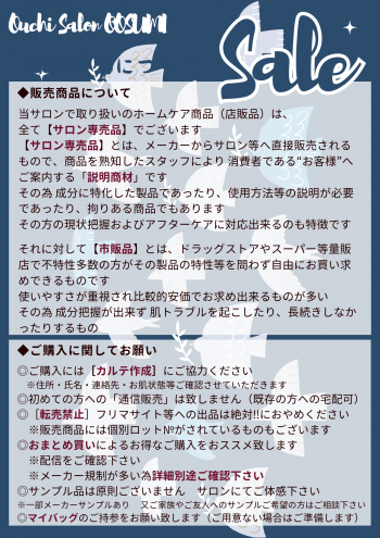 サロン専売品の一部は、個別ロット№が付けれれているものもございます フリマサイト等に出店されました事実が発覚した場合は、当サロンと当該お客様との関係が壊れるだけでなく、当サロンとメーカーとの取引も解消される可能性もあり、多くのお客様にご迷惑をおかけする事になります